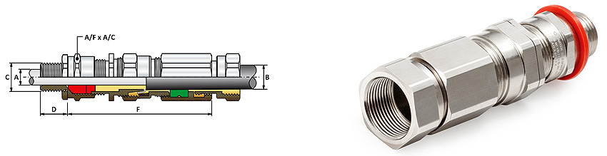 For indoor & outdoor hazardous area use with all types of SWA cable providing flameproof seal on cable inner sheath and environmental seal on cable outer sheaths. Also provides mechanical retention & electrical continuity via armour wire termination with rotating rigid conduit connection facility.